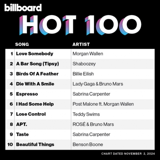 미국 빌보드에 따르면, 걸 그룹 블랙핑크 멤버 로제와 팝 가수 브루노 마스의 듀엣곡 'APT.'는 메인 차트 '핫 100' 8위를 차지했다. K팝 여성 가수가 빌보드 '핫 100' 톱10에 이름을 올린 것은 로제가 처음이다.