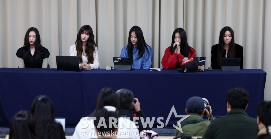 뉴진스(민지, 하니, 다니엘, 해린, 혜인)는 28일 오후 서울 강남구 삼성동 스페이스쉐어 삼성역센터에서 전속 계약 해지 관련 긴급 기자회견을 개최했다.