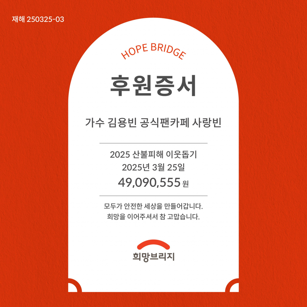 희망브리지 전국재해구호협회(회장 송필호)는 김용빈 공식 팬카페 '사랑빈'이 산불 피해 지원 성금으로 4909만 555원을 기부해왔다고 25일 밝혔다. 팬카페는 이틀 동안 자체적으로 모금행사를 진행했다.