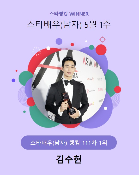 김수현은 1일 오후 3시 1분부터 8일 오후 3시까지 진행된 5월 1주(111차) 스타랭킹 스타배우 남자 랭킹 투표에서 66만 6492표를 차지하며 1위에 등극했다. 김수현이 스타랭킹 스타배우 남자 부문에서 1위를 차지한 것은 이번이 처음이다.