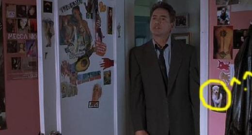 오는 10일 국내 개봉예정인 '찰리 바틀렛'에서 공립고등학교 교장역의 배우 로버트 다우니 주니어가 서 있는 옆 벽면에 개죽이의 사진이 걸렸다.