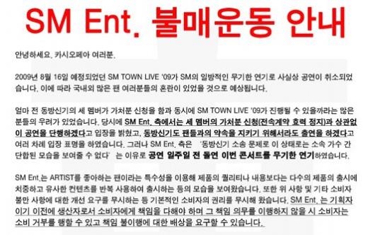 팬들은 “8월 16일로 예정됐던 ‘SM 타운 라이브 09’의 일방적인 무기한 연기로 사실상 공연이 취소됐다”며 “팬이라는 특수성을 이용해 제품의 질이나 내용보다는 다수의 제품 출시에 치중하고 유사 콘텐츠를 반복 출시하는 등 모습을 보여왔다”고 지적했다.