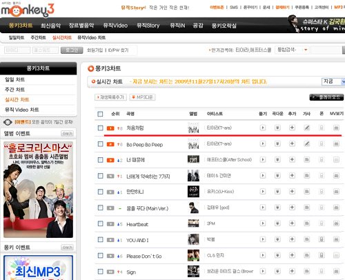 음악전문사이트 몽키3 측은 27일 오후 "티아라가 오늘 공개한 신곡들인 '처음처럼'과 '보 핍 보 핍'(Bo Peep Bo Peep)은 오후 5시 20분 현재 실시간 차트에서 나란히 1, 2위에 자리하고 있다"고 밝혔다.
