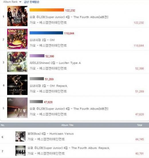 여기에 소녀시대 정규 2집 '오!' 리패키지 앨범(5만 1269장)이 4위, 슈퍼주니어 정규 4집 B버전(4만 7628장)이 5위, 슈퍼주니어 정규 4집 리패키지 앨범(4만 791장)이 7위를 각각 차지하고 있다.