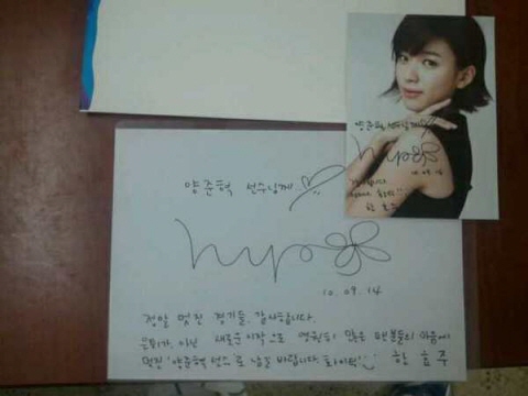한효주는 자신의 얼굴이 담긴 사인지에 "정말 멋진 경기들 감사합니다. 은퇴가 아닌 새로운 시작으로 영원히 많은 팬분들의 마음에 멋진 '양준혁 선수'로 남길 바랍니다. 화이팅. 한효주. 2010.09.14"라고 밝혔다.