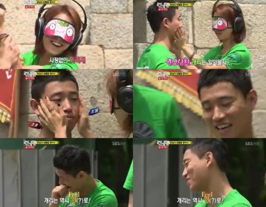 안대를 벗은 송지효는 "광수는 눈썹 뼈를 만지고 맞췄고, 김종국은 뾰족한 턱 선 때문에 알았다"고 말하며 "개리는.."이라며 부끄러운 듯 말끝을 흐렸다.