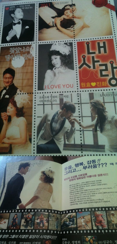 사진 속 청첩장은 일반 청첩장과는 다르게 영화 팸플릿처럼 구성되어 있다. '내 사랑' 이라는 제목이 쓰여 있어 마치 진짜 영화 포스터를 보는 것 같아 눈길을 끈다.