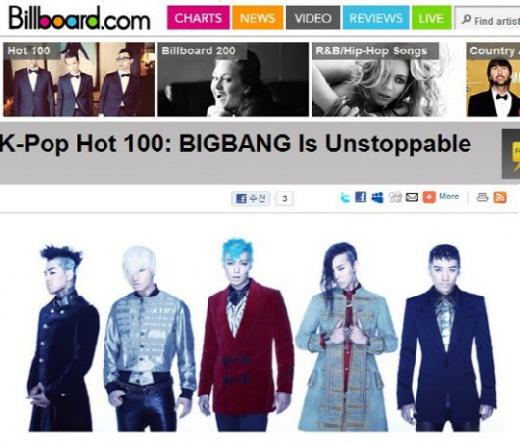 빅뱅은 13일(현지시간) 세계적인 음악차트 빌보드의 소개를 받았다. 빌보드는 'BIG BANG is Unstoppable'이란 타이틀로 K-팝 차트를 휩쓴 빅뱅에 대해 소개했다.