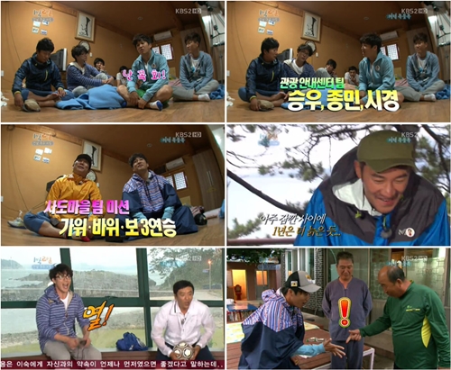 24일 오후 방송한 KBS 2TV '해피선데이-1박2일'(이하 '1박2일')에서는 김승우 이수근 엄태웅 차태현 성시경 김종민 주원 등 일곱 멤버가 전남 여수 사도에서 험난한 1박2일을 보내는 모습이 그려졌다.