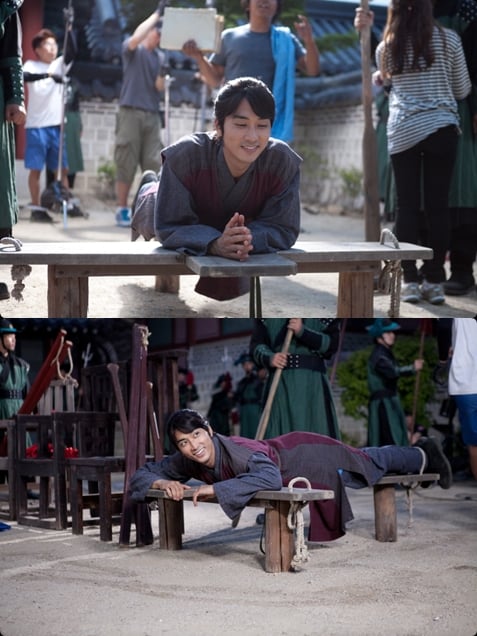 26일 소속사가 공개한 촬영장 사진에서 송승헌은 곤장을 맞기 위해 누워 있으면서도 훈훈한 '보살미소'를 지어 웃음을 자아낸다.