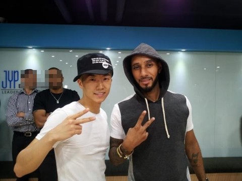 그룹 2PM 멤버 우영이 미국의 유명 프로듀서 스위즈 비츠(Swizz Beatz)와 함께한 인증샷을 공개했다.