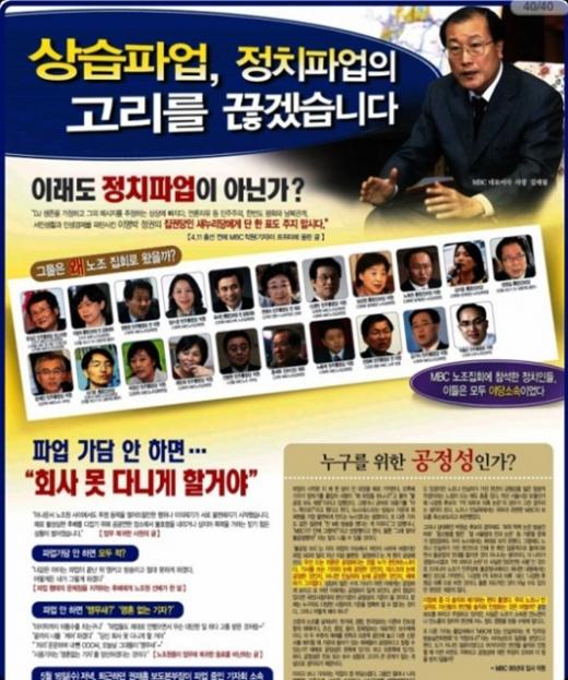 MBC가 신문 지면에 노조 파업을 정치파업이라 규정하는 전면광고를 실어 노조가 즉각 반발에 나섰다.