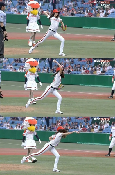 연습의 결과대로 한혜진은 시구는 성공적이었다. 긴 팔과 다리를 이용해 와인드업 자세를 잡았고 야구공은 시원하게 날아갔다.