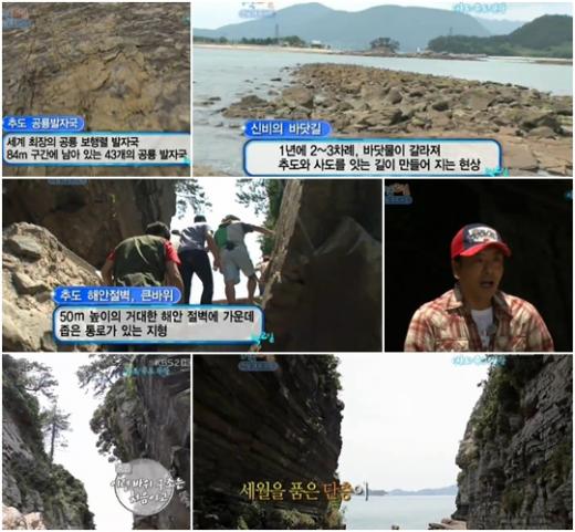 1억 년 전의 공룡 발자국이 그대로 남아있는 추도 공룡 발자국과 봄이면 바닷길이 열린다는 신비의 바닷길 등 신비한 추도의 모습에 멤버들은 감탄을 금치 못했다.