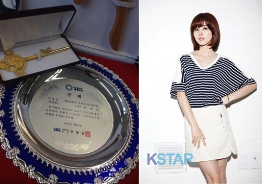 공개된 사진 속에는 SBS 우원길 사장이 한혜진에게 수여한 접시 모양의 상패가 담겨있다. 상패에 따르면 한혜진은 MC로 출연 중인 SBS '힐링캠프-기쁘지 아니한가'로 2012 상반기 프로그램 평가심의 특별상을 수상했다.