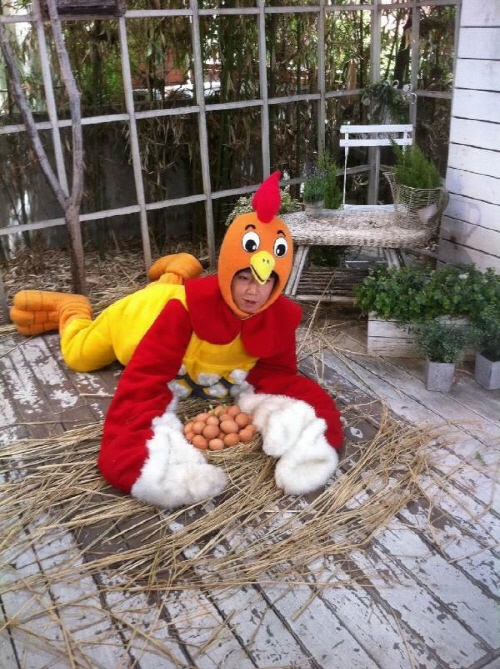 공개된 사진 속 김기열은 닭 모양의 인형 탈을 쓰고 바닥에 엎드린 채 계란을 안고 있는 모습이다. 특히 김기열의 멍한 표정이 웃음을 준다.