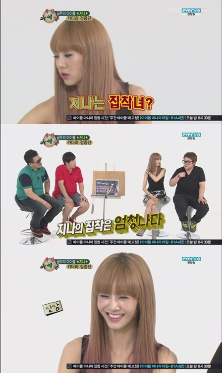 이날 방송에서 MC 정형돈은 지나에게 "매니저에게 집착이 심하다는 소문이 있다"고 질문했고, 이에 지나의 매니저는 스튜디오에 등장해 지나의 집착증세를 폭로했다.