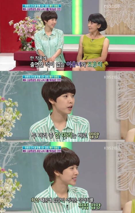 이어 조윤희는 "현재 이용녀의 집에서 데리고 온 개를 포함해 총 다섯 마리를 키우고 있다"며 "가끔 이용녀의 집에 방문해 목욕, 털 깎기, 입양 주선을 돕는다"고 친분을 과시했다.