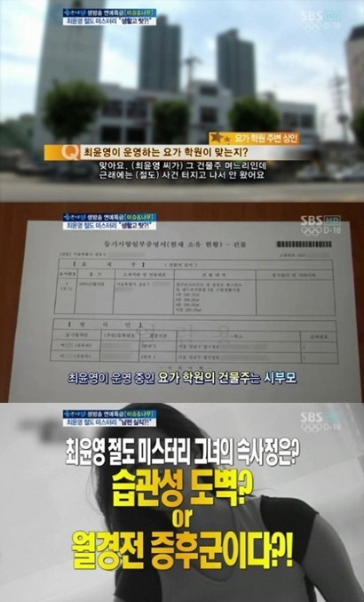 9일 방송된 SBS TV '좋은 아침'에는 최윤영이 절도 혐의를 둘러싼 미스터리와 관련해 그녀가 운영 중인 것으로 알려진 서울의 한 요가 학원을 찾았다.