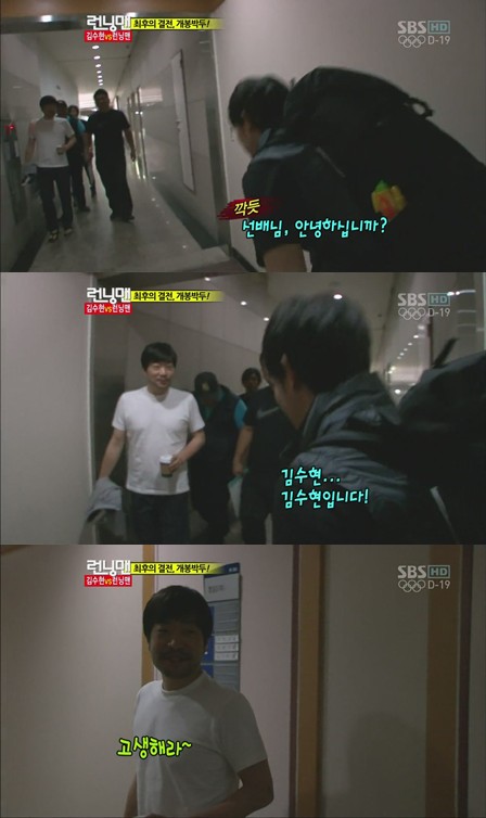 이날 방송에서 김수현은 미션수행을 위해 SBS 드라마 제작센터에 미리 잠입해 있던 중, 드라마 '추적자' 촬영에 한창이던 손현주를 발견하자 쏜살같이 달려가 90도로 머리를 숙여 인사를 하는 예의바른 모습을 선보였다.