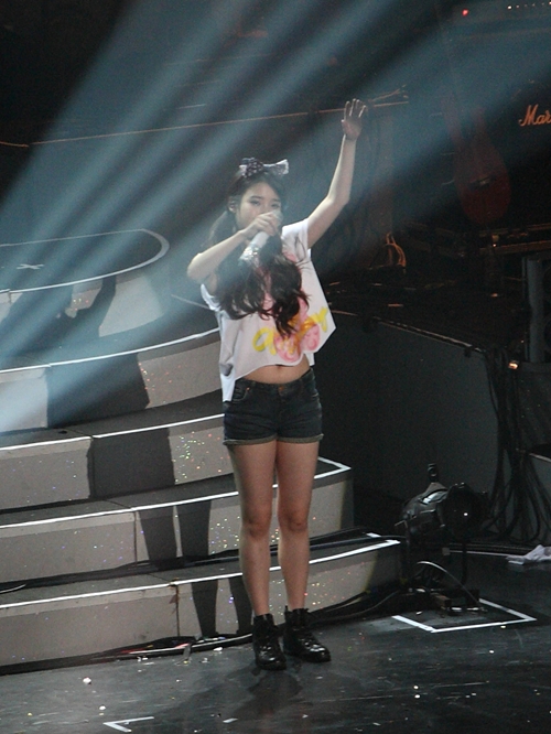 사진 속 아이유는 지난 달 초부터 시작한 첫 단독 콘서트 '리얼 판타지'의 무대에 올라 짧은 바지와 양갈래 머리, 귀여운 머리띠 차림으로 깜찍한 매력을 보여주고 있다. 특히 이날 공연 중 아이유가 입은 짧은 길이의 상의가 손을 위로 들자 살짝 올라가면서 아이유의 뱃살이 포착됐다.