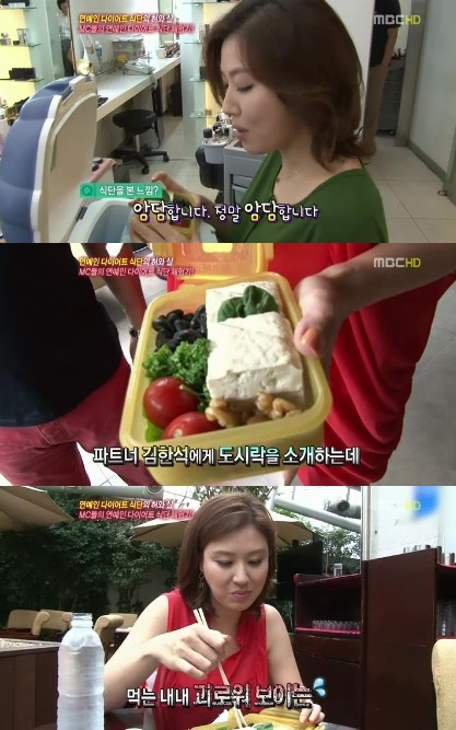 이날 방송에서 MC 김성경과 김한석은 각각 황정음과 박시후가 체중감량에 성공한 다이어트 식단을 하루씩 체험해보는 시간을 가졌고, 김성경은 찐 검은콩과 두부 반모가 주식을 이루는 황정음 다이어트 식단에 도전해 눈길을 끌었다.