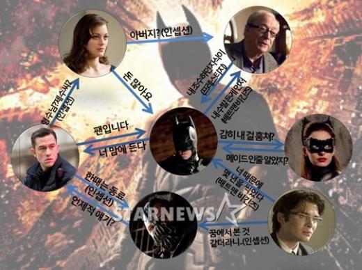 브루스 웨인(크리스찬 베일)이 알프레도(마이클 케인)의 조수라면? 베인(톰 하디)과 존 블레이크(조셉 고든 레빗)가 동료라면? '다크 나이트 라이즈'에서 생길 수 없는 인연이 크리스토퍼 놀란 감독의 전작에서는 가능했다.