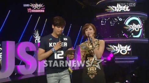 두 사람은 27일 오후 방송된 '뮤직뱅크' 2012 런던 올림픽 특집에서 애프터스쿨 무대를 소개하는 깜짝 MC로 등장했다.