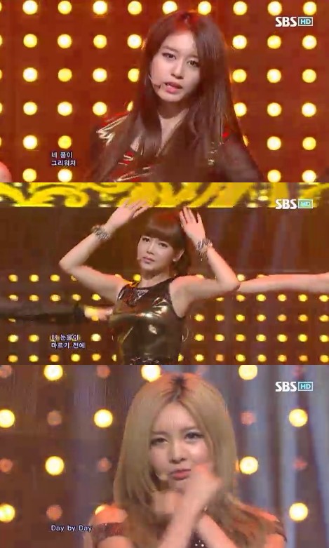 티아라는 29일 오후 생방송으로 진행된 SBS 가요순위 프로그램 '인기가요'에 출연해 '데이 바이 데이'를 선보였다. 화영과 소연이 빠진 채 진행된 27일 KBS 2TV '뮤직뱅크' 이후 2번째 무대다.