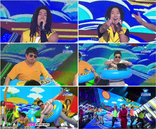 정형돈과 데프콘은 허리에 고무튜브를 두른 채 무대 내내 뒷편에서 대기하다 마지막 후렴구가 나올 무렵 깜짝 등장, 하하와 스컬, 피쳐링을 맡은 이단옆차기와 함께 신나는 무대를 꾸몄다. 흥겨운 무대 가운데서도 정형돈과 데프콘의 허리에 꽉 낀 고무튜브가 더욱 웃음을 자아냈다.
