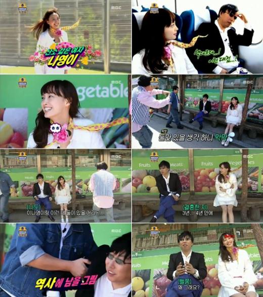 한편 이날 이나영을 비롯해 유재석 박명수 정준하 정형돈 노홍철 하하 길 등 촌티패션의 '무한도전' 멤버들, 게스트 데프콘, 이태성, 이준 등이 출연해 특집을 꾸몄다. 이나영은 하늘까지 치솟은 알록달록한 스카프와 하얀 원피스의 복고풍 차림으로 등장해 눈길을 모았다.