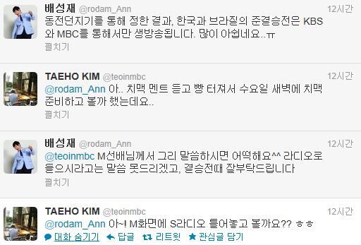 김태호PD는 지난 6일 오후 SBS 배성재 아나운서의 트위터에 "아! M화면에 S라디오 틀어놓고 볼까요?"라는 글을 게재했다. 이는 배성재 아나운서가 이날 자신의 트위터를 통해 "동전던지기를 통해 정한 결과 한국과 브라질의 준결승전은 KBS와 MBC를 통해서만 생방송됩니다. 많이 아쉽네요"라고 올린 글에 대한 대답이었다.