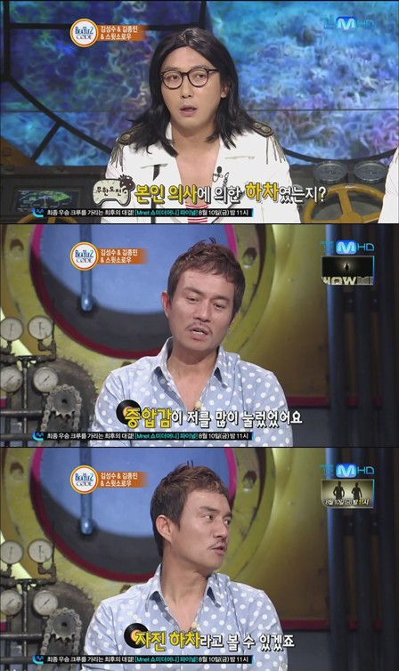 이날 방송에서 MC 탁재훈은 "'무한도전' 하차는 본인에 의한 하차였느냐?"고 물었고, 이에 김성수는 "사실 프로그램을 하면서 중압감이 들었다. 스튜디오에서 멘트를 많이 해야했고, 그런 면에서 자진 하차라고 볼 수 있다"고 언급했다.