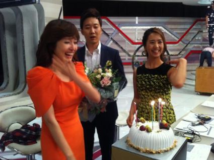 프로그램 공동MC인 이지애 아나운서도 자리했으며 도경완 아나운서는 옆에서 꽃을 들고 서 있다. 김경란 아나운서는 아쉬운 듯 눈물이 글썽한 표정을 짓고 있다.