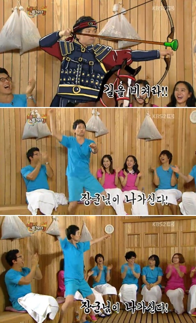 그는 사극을 접목시켜 춤을 추면서 활을 쏘고 '"하앗"이라며 말을 타는 모습 등을 선보여 색다른 말춤을 보여 스튜디오를 발칵 뒤집어 놨다.