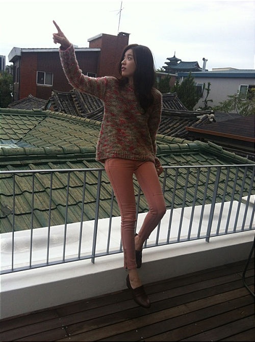 게재된 사진 속 한효주는 옥상 난간에 걸터앉아 하늘을 향해 손을 뻗어 마치 외계인과 교신을 하는 듯한 포즈를 취하고 있다.