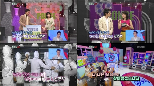 '스펀지'의 MC 이휘재는 "2003년 11월 첫 방송한 '스펀지'가 오늘로 447회로 마지막 인사를 드리겠습니다"며 "정말 감사드린다"며 '스펀지'의 종영을 알렸다.