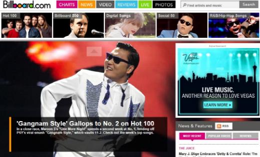 빌보드는 싸이 '강남스타일'의 핫 100 차트 2위 소식을 이날 홈페이지 메인 화면을 통해 전했다. 또한 '싸이, 이제 1위까지는 단 한 계단 남았다'는 글도 올렸다.