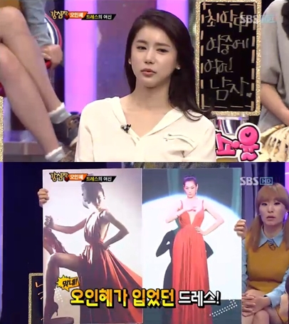 오인혜는 2일 오후 방송된 SBS 예능 프로그램 '강심장'에 출연해 인터넷을 뜨겁게 달구었던 드레스에 대한 비하인드 스토리를 공개했다.