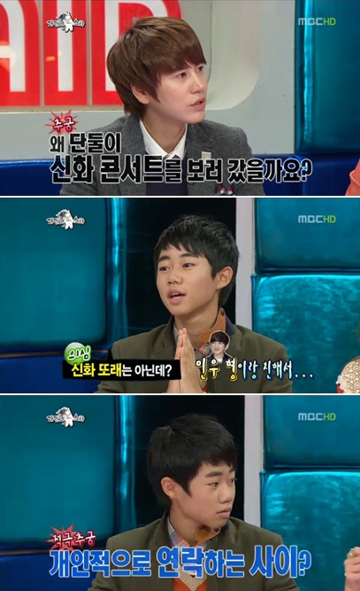이어 규현은 "그런데 왜 단둘이 신화 콘서트를 보러 갔느냐"라고 물었고, 이에 당황한 박지빈은 "신화의 민우 형이랑 친해서 갔다"며 "저랑 유정이랑 매니저 형이랑 갔다"고 해명했다.