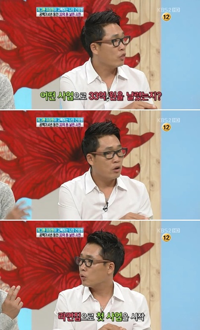 하지만 그는 여기서 끝나지 않고 "그리고 안 되어서 지인의 제안으로 꼬치구이를 했지만 안됐다"며 "이어 화로 꼬치구이를 했고, 이대에서 꼬치를 빼고 화로구이만 했지만 바로 망했다"며 33억을 사업으로 다 날렸던 사연을 밝혀 모두를 놀라게 했다.