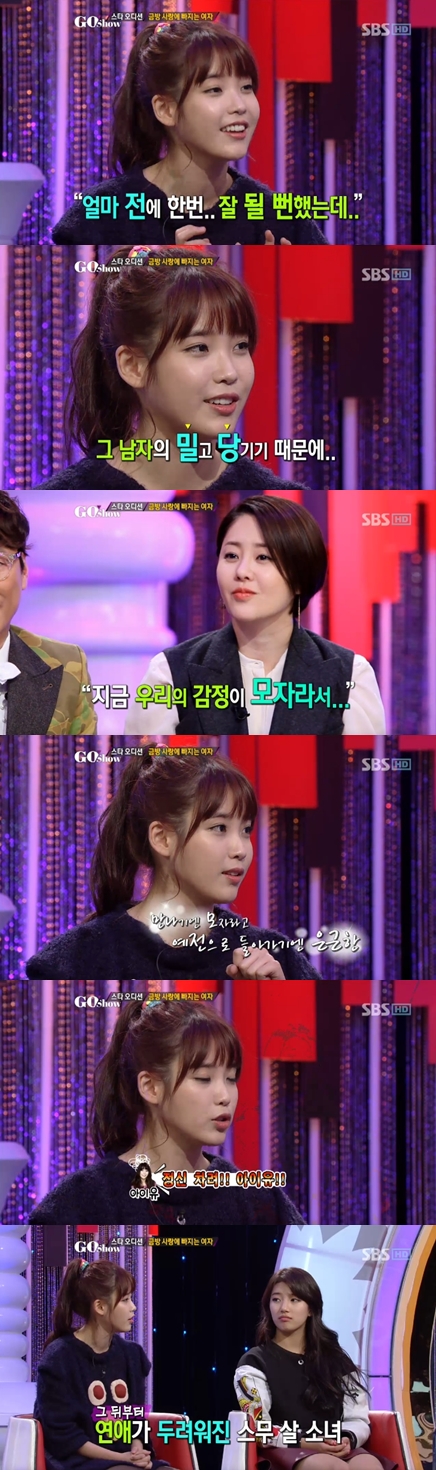 2일 오후 방송된 SBS '고쇼'에서는 브라운 아이드 걸스(제아, 나르샤, 미료, 가인)의 멤버 가인, 아이유, 미쓰에이(페이, 지아, 수지, 민)의 수지가 출연해 솔직한 이야기를 펼쳤다.
