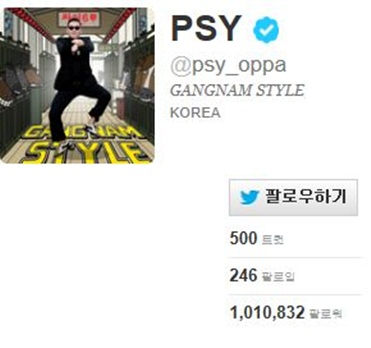 싸이는 3일 트위터 팔로워 100만 명을 돌파한 후 현재 101만 832명의 팔로워수(오후 2시 기준)를 기록하고 있다.