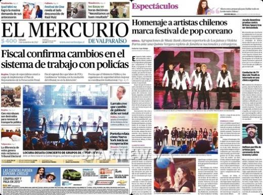 그룹 엠블랙(승호 지오 이준 천둥 미르)이 칠레 언론의 1면을 장식하며 남미 대세 가수임을 입증했다.