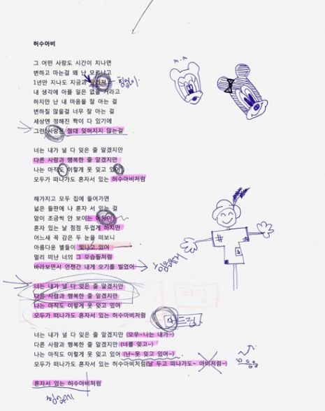 '나는 아직도 이렇게 못 잊고 있어. 모두가 떠나가도 혼자서 있는 허수아비처럼. 앞이 조금씩 안 보이는 어둠이 혼자 잇는 날 점점 두렵게 하지만'이라는 등 사랑하는 이를 하염없이 바라만 보며 아무것도 할 수 없는 사람의 슬픈 심정을 허수아비에 빗대어 표현한 노랫말 역시 인상적이다.
