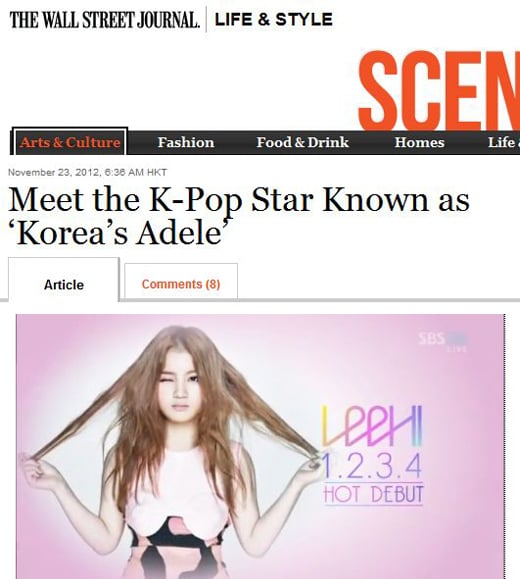월스트리트저널은 최근 아시아 섹션 블로그를 통해 '한국의 아델'로 알려진 K팝스타를 만나다'(Meet the K-Pop Star Known as 'Korea's Adele')이란 제목의 기사를 올리고 이하이를 소개했다. 또 SBS '인기가요' 출연 무대 영상도 게재했다.