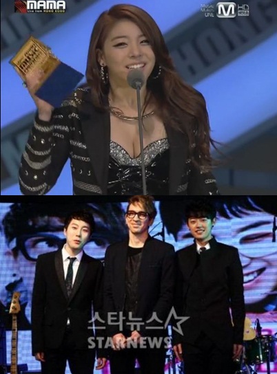 3인 밴드 버스커 버스커와 여자 솔로 가수 에일리가 2012 MAMA에서 남자 및 여자 부문 신인상을 차지했다.
