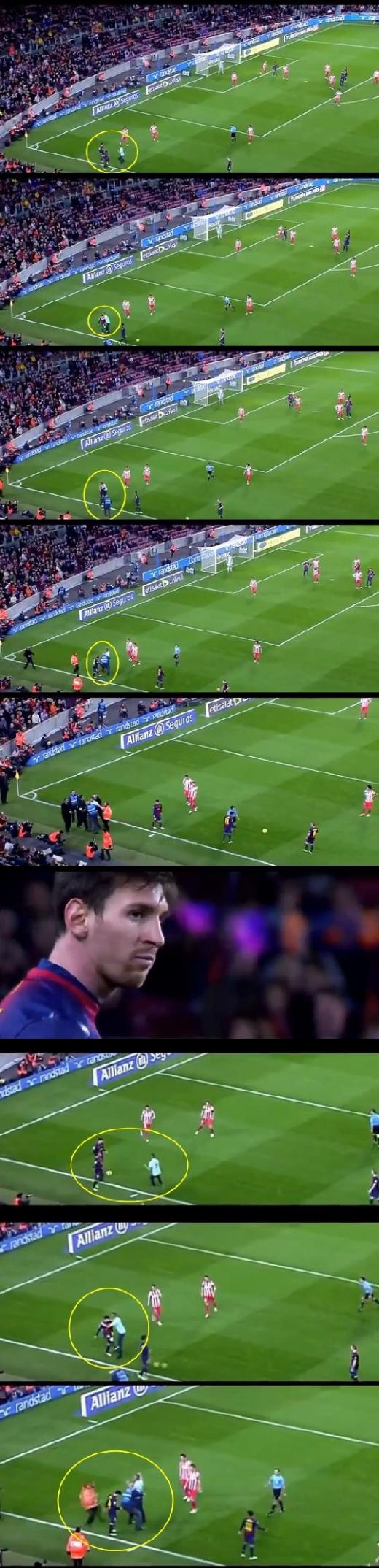 한편 이날 경기 종료 직전 해프닝이 발생했다. 터치라인 근처에서 메시가 공을 드리블하고 있었다. 그런데 이때 한 남성팬이 메시를 향해 돌진했다. 메시의 열혈팬이었던 것이다. 이 팬은 메시를 꼭 끌어안은 뒤 마치 세상을 다 가진 듯한 제스쳐를 취하며 기뻐했다. 하지만 이 남성은 이내 경기장 관리 경호원들에 의해 그라운드 바깥으로 끌려 나갔다.