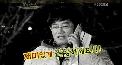 이경규는 지인에게 전화를 걸어 현장(강화도)으로 올 것을 요구, 가장 먼저 오는 현장에 지인이 도착하는 사람이 리더가 된다는 미션을 받고 SBS '힐링캠프'에서 함께 진행을 맡고 있는 한혜진에게 전화를 걸었다.
