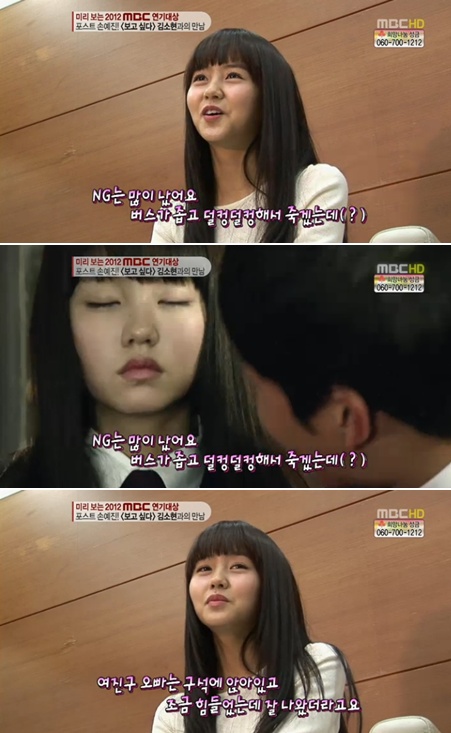 이날 김소현은 아역배우 여진구(한정우 역)와의 버스 키스신 에피소드에 대해 묻는 제작진의 질문에 "NG가 많이 났었다"며 입을 열었다.